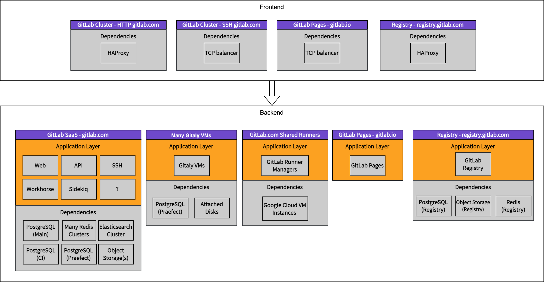 The diagram represents simplified GitLab.com deployment components before the introduction of a Cells architecture. This diagram intentionally misses some services that are not relevant for the architecture overview (Cloudflare, Consul, PgBouncers, ...). Those services are considered to be Cell-local, with the exception of Cloudflare.