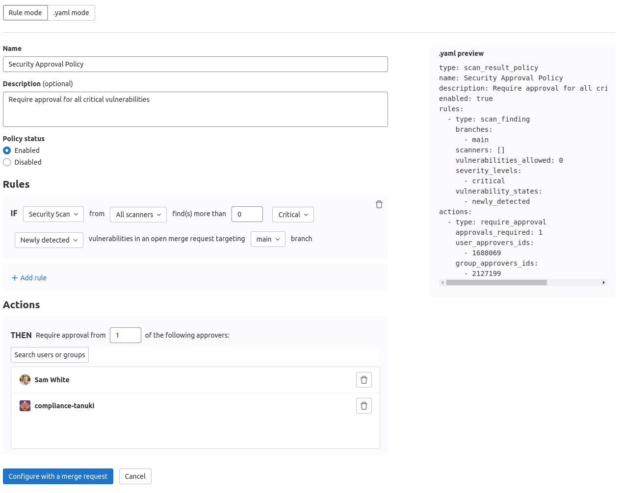 When you finish creating or editing your policy, save and apply it by selecting the Configure with a merge request button and then merging the resulting merge request. When you press this button, the policy YAML is validated and any resulting errors are displayed. Additionally, if you are a project owner and a security policy project has not been previously associated with this project, then a new project is created and associated automatically at the same time that the first policy merge request is created.