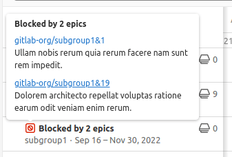 Introduced in GitLab 15.5: View blocking epics when hovering over the "blocked" icon.